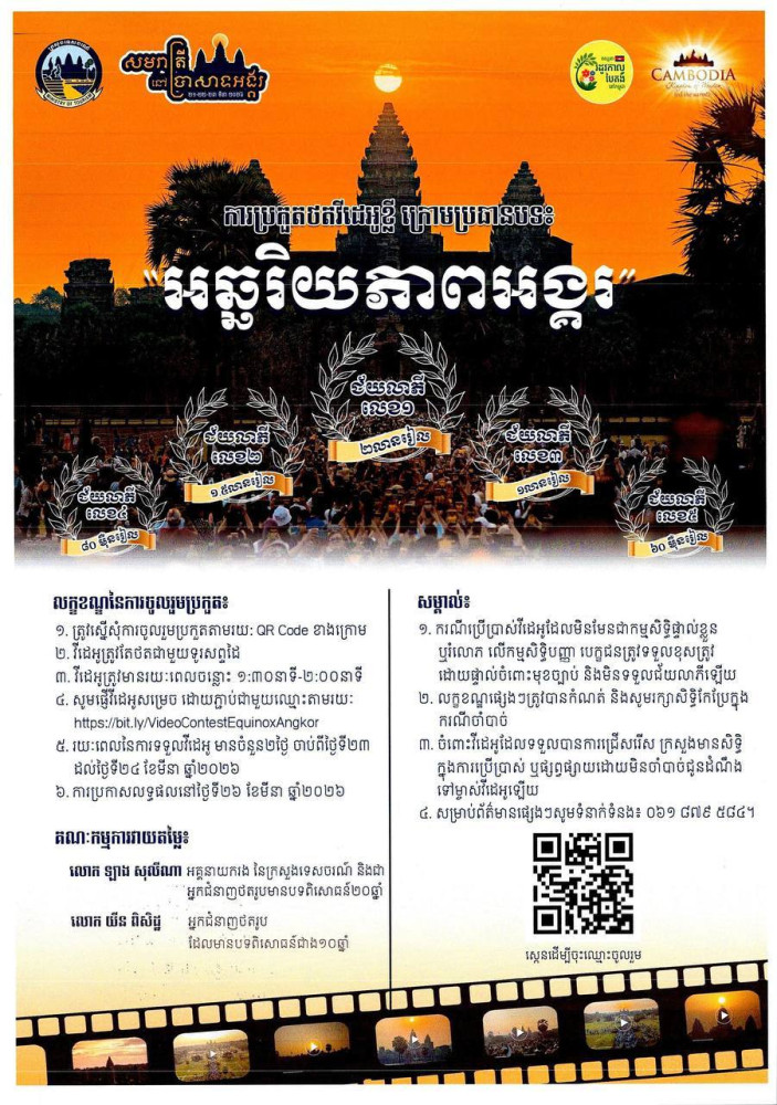为进一步推广这一特色活动,旅游部面向游客及社会公众发起赛事,邀请大家用手机拍摄吴哥窟春分景观参与比拼。参赛者需扫码完成注册,提交时长1分30秒至2分钟的相关视频;大赛于2026年3月21日至22日开展,视频提交时间为2026年3月23日至24日,提交链接为:https://bit.ly/VideoEquinoxAngkorContest。