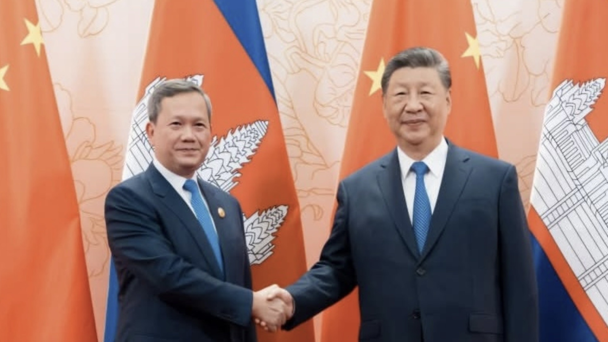 中国国家主席习近平(右)会见柬埔寨首相洪玛奈(左)